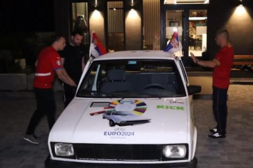 Najveća atrakcija Evropskog prvenstva u Nemačkoj su upravo Vrnjčani i komšije Trsteničani koji su došli na ideju da krenu automobilom marke yugo 55 iz 2000. godine.